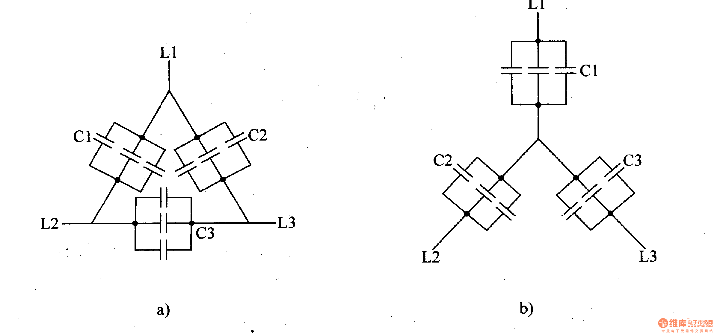 主电容器组的联结方式应根据电容器的耐压值而定。若电容器的耐压值为250V,则应接成Y形;若电容器的耐压值高于400V,则可接成A形。使用时,为了达到规定的电容量,可采用多只电容器并联的方法,如图5-188所示。