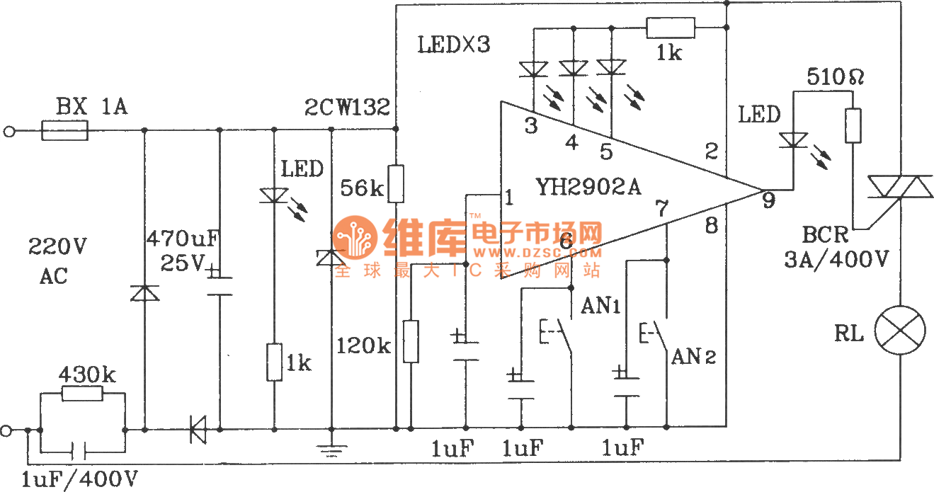 由YH2902A多功能定时控制模块构成多功能延时照明灯控制电路