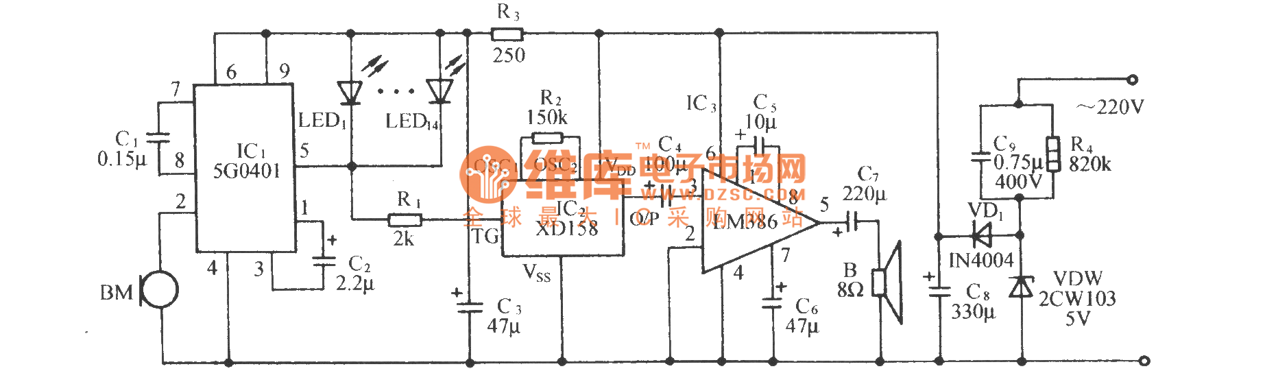 5G0401声控同步闪光伴迪斯科鼓点乐电路