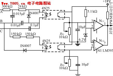。。这是一种用于三相三线制电源缺相保护电路,A、B、C缺任何一相,光耦器输出电平低于比较器的反相输入端的基准电压,比较器输出低电平,封锁PWM驱动信号,关闭电源。比较器输入极性稍加变动,亦可用高电平封锁PWM信号。这种缺相保护电路采用光耦隔离强电,安全可靠,RP1、RP2用于调节缺相保护动作阈值。