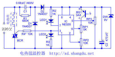 工作原理:电路如下图所示。图中IC为NE555时基电路;RP3为温度调节电位器,其滑动臂电位决定IC的触发电位V2和阈电位Vf,且V5=Vf=2Vz。220V交流电压经C1、R1限流降压,D1、D2整流,C2滤波,DW稳压后,获得9V左右的电压供IC用。室温下接通电源,因已调V2Vz、V6Vf,IC③脚为高电位,BCR被触发导通,电热丝通电发热,温度逐渐升高。热敏传感器BG1随温度的升高,其穿透电流Iceo增大,V2、V6升高。当V2>Vz,V6≥Vf时,IC翻转,③脚变为低电位,BCR截止邮电局热丝停止发热,温度开始逐渐下降,BG1的Iceo随之逐渐减小,V2、V6降低。当V6Vf,V2≤Vz时,IC③脚回到高电位,BCR又被触发导通,电热丝又开始发热。实践证明,调节RP2使V2=1/2V6时,温差为零;而V2=V6时最大。 查看联系方式