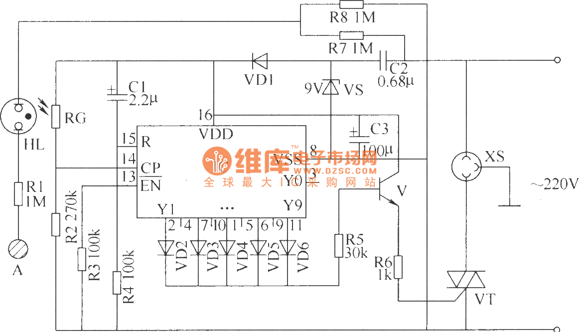 元器件选择 R1~R8选用1/4W碳膜电阻器或金属膜电阻器。 RG选用亮阻为20ki2左右、暗阻大于2M12的光敏电阻器。 C1和C3均选用耐压值为16V的铝电解电容器;C2选用耐压值为400V以上的涤纶电容器或CBB电容器。 VD1选用1N4007型硅整流二极管;VD2~VD6均选用1N4148型硅开关二极管。 VS选用1W、9V硅稳压二极管。 V选用S9013或3DG9013、C8050等型号的硅NPN晶体管。 VT选用耐压值大于400V的双向晶闸管,其电流容量应根据负载的功率而定。 IC选用CD4017型十进制计数分配器集成电路。 HL选用启辉电压低于l00V的氖指示灯。 A用10mm×10mm的铜片或敷铜板自制。