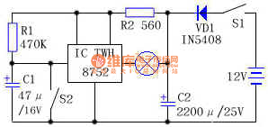 电路原理如图所示:S1是电源开关,由车锁控制,S2为原刹车灯控制开关。闭合开关S1,由于电容C1两端的电压不能突变,IC的②脚为低电平,刹车灯H亮,几秒钟后,由于C1被放电,使IC的②脚电压高于1.6V时,灯H熄灭。当行驶中的摩托车遇到情况减速或停车时,开关S2闭合将C1两端短路放电,使开关IC的②脚变成低电平,刹车灯H随即被点亮,S2复位后,H须延时几秒钟后才能熄灭。