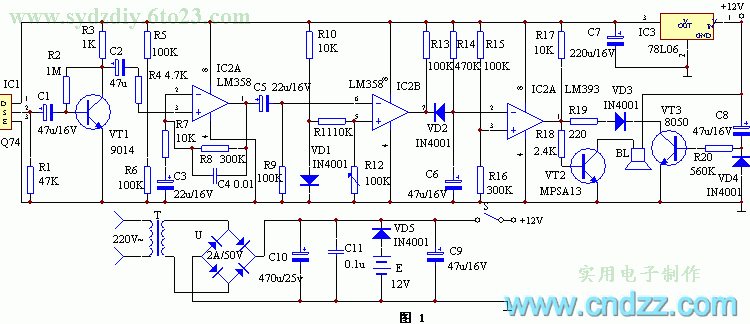 IC1采用进口器件Q74,波长为9-10um。IC2采用运放LM358,具有高增益、低功耗。IC3、IC4为双电压比较器LM393,低功耗、低失调电压。其中C2、C5一定要用漏电极小的钽电容,否则调试会受到影响。R12是调整灵敏度的关键元件,应选用线性高精度密封型。