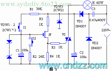 场效应管JF的IDSS≥5mA,BVDS≥15V,可控硅VS选用1A/400V即可,如3CTS1A等。其它元件无特殊要求,具体数值已标在图(表)中。电阻R1、R2的数值决定了电容C1的充放电时间。在制作时,若光线变化太快时,应适当增大R1、R2的数值,反之应减小。