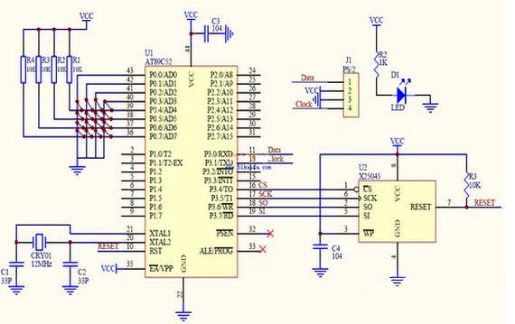 图1为该键盘电路原理图,由ATMEL公司的微控制器AT89C52、逻辑系统、矩阵键盘三部分组成。AT89C52单片机主要完成键盘扫描,确定键盘闭合断开的信息,并发送键码和同步时钟到工控机;逻辑系统提供起振信号及看门狗定时复位功能,防止出现死机;矩阵键盘为4×4的行列式键盘,当有键按下时产生低电平触发信号,便于单片机检测有效的按键操作。该键盘由4×4=16 个按键组成,其中行线为P0.4~P0.7,列线为P0.3~P0.0.P3.0为键码数据输出,P3.1为同步时钟,分别输出到嵌入式PC的PS/2端口;+5V电源由主机提供。由于AT89C52的IO端口为32个,除看门狗电路的输入输出端CS、SI、SO、SCK、以及键码数据输出端 Data和时钟输出端Clock外,还剩26个可用端口,这样,其最大可独立响应13× 13=169个键的输入,不仅可满足标准键盘的多键需求,也可满足工控机常用控制键的要求。X25045为看门狗电路,它实时接收来自AT89C52的 CS信号,并自动判断两次信号的间隔时间。当时间间隔到达设定时间时,其RST输出端保持低电平;反之,其RST输出端输出高电平,AT89C52被复位。此外增加了发光二极管LED,用来指示键盘的工作状态。