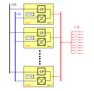 模块化UPS,顾名思义,是将大功率的UPS系统,分开成多个子模块并联,通过优化的系统控制,实现系统的在线扩容升级、维护,并大幅提高系统的可靠性、可用性和节能效果,降低客户的维护成本,近年来已经渐渐成为主流客户的首选。下面以市场上典型的基于10个30kVA功率模块的300kVA系统来做分析。