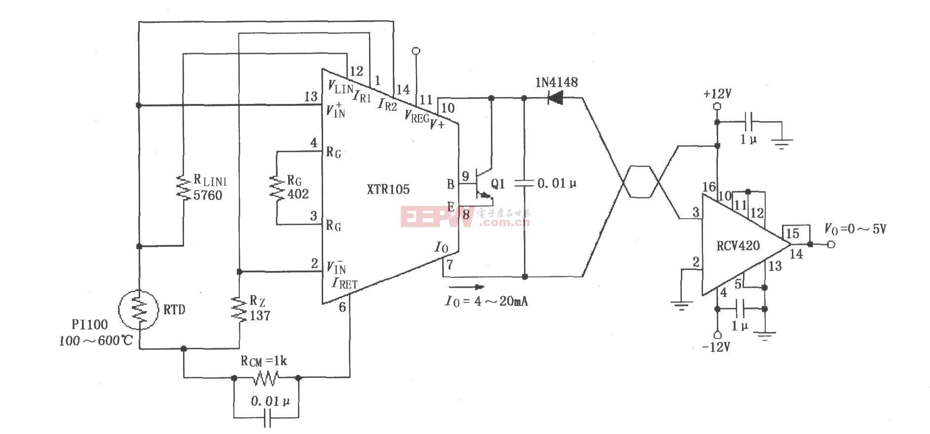 如图所示,RTD采用Pt100型热电偶。当温度为100~600oC时,XTR105的输出电流为4~20mA,RCV420的输出电压为0~5V。图中为两线RTD连接,若用于远程RTD,建议采用三线RTDs连接,RG为383Ω,RLIN2为8060Ω。