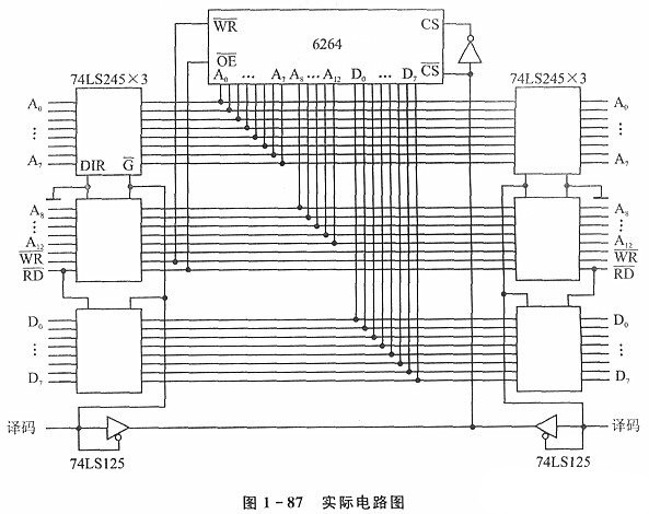 图1- 87所示为实际电路图。图中共用的RAM为6264.它有8根数据总线(Do~D7),13根地址总线( Ao~A12),4根控制总线(WR、OE、CS、CS),2根电源线。当两微机系统共用RAM时,必须用缓冲器将其隔离。当某机需要占用时,则对一机导通,而对另一机隔离;否则两机将同时出现故障。在图1- 87所示电路中,缓冲器选用74LS245,它是8位双向缓冲器。因为6264共有24根总线,故用6片74LS245与一片74LS125三态门。74LS245有一个方向控制端DIR,一个允许端G。DIR直接接于RD或接固定电位(+5 V,0 V)。用于数据线缓冲时,DIR要接RD;用于地址线和控制线时,DIR要接固定电位(+5 V,0 V)。一般的CPU,RD信号总是出现在地址信号的后面,如8080、8031等。如果G接于RD,则会出现RAM数据还没准备就写或读,系统就会出现故障。因此,G接于系统的译码端是比较合适的。