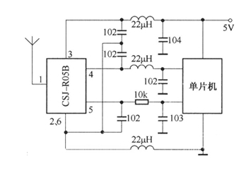 图中所示的是单片机控制CSJ-R05B电路,CSJ-R05B是工业级超外差式微型接收组件,它在CSJ-R05A组件的基础上增加了声表面波谐振荡器稳频的本机振荡器和休眠(省电)控制电路扩充而成,它对温度,电源电压及使用环境的变化都有很好的适应性,可满足比较恶劣环境中的是使用要求。