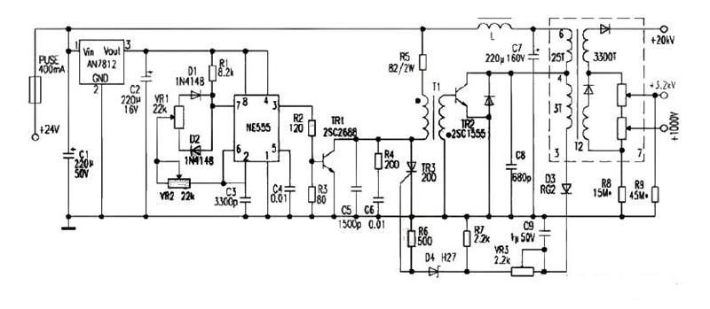 目前,一些照相机CRT使用11.4cm(4.5英寸)纯平面CRT作为显示部件,其高压部件的阳极电压为+20kV,聚焦极电压为+3.2kV,加速极电压为+1000V,高压部件供电为直流24V.本文的电路是为替换维修这些显示器的高压部件而设计的。电路由NE555构成脉冲发生器,调节电位器VR2可使之产生频率为20kHz左右的脉冲,电位器VR1调脉宽。TR1为推动级,脉冲变压器T1采用反极性激励,即TR1导通时TR2截止,TR1截止时TR2导通,D3、C9、VR3、R7及D4、R6、TR3组成高压保护电路。VR2用于调频率,调节VR2可调整高压大小。