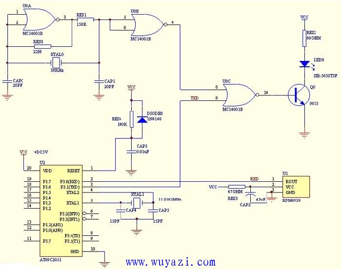 本文介绍的电路,原是在分时电度表中,用于校时和抄表的实际电路,它既简单又实用。用红外光发射管sir-563和红外光接收ic管rpm6938来实现接受和发送点信号的功能,可以实现半双工双向通讯功能。通讯距离约10米,异步通讯波特率1200 .