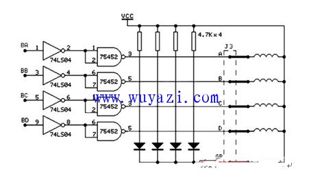 它是工业控制及仪表中最常用的控制元件之一,它有输入脉冲与电机轴转成比例的特征,在智能机器人、软盘驱动器、数据机床中广泛运用,微电脑控制步进电机最适宜系统中设计使用20BY-0型号步进电机,它实用+5V直流电源,步距角为18度,电机线圈由四相组成。下图是一款步进电机及其驱动原理电路图。