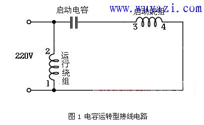 220V交流单相电机起动方式大概分一下几种:第一种,分相起动式,如图1所示,系由辅助起动绕组来辅助启动,其起动转矩不大。运转速率大致保持定值。主要应用于电风扇,空调风扇电动机,洗衣机等电机接线电路图,如图1。