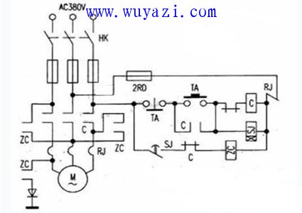 本文所介绍的电路简单可靠,适用于5kW以下的电动机。工作过程:按下启动按钮QA,接触器IC线圈得电,电动机转动,同时电容器C被充电,停车时按下TA按钮,接触器IC失电断开电动机,电容C对线圈阻值为3kΩ的高灵敏继电器J放电,使J吸合,2C接触器线圈得电吸合,从而进行直流能耗制动,经一定时间后,电容C放电完毕,继电器J释放,此时制动结束。选择电容C容量的大小,可改变制动时间的长短。