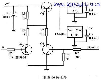 电源切换电路主要的功能是在系统关机时,转由锂电池给USB供电并完成数据的保存,其电源切换如图4所示。图中,当外部开机后,V为高电平使三极管Q2导通,同时把Q1的基极拉至低电平,使其导通。外部电源V经过二极管D1后(VC)给单片机电路和USB供电。由于程序在初始时把POWER置高,所以,此时Q2也是导通的。当系统关机后,V变成低电平,三极管Q2截止。但是,由于此时Q3是导通的,所以Q1仍导通,只是此时是由锂电池供电来完成数据的保存,这时,单片机的定时器l开始工作,并在延时10 s后,使POWER的输出为低电平,从而使Q3关断,并最终使Q1的基极变高,整个记录仪关闭。