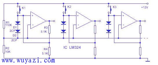 电路中的开关的核心器件为四运放LM324,经巧妙设计,使每个运放有两重功能,电压比较器和施密特触发器。电压适用范围宽,档位可任意设计,如果加一档空档,可作为总复位,与数字电路配合时,可用同一电源,开关的输入输出电平符合数字电路的接口电平,由于运放的输入阻抗高,开关的输入电流小,可以用轻触开关。导电橡胶。薄膜开关作按键,或光、电、磁等转换信号驱动,可用三极管。可控硅。继电器等。