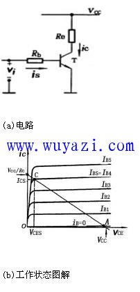 图(a)中三极管为NPN型硅管。电阻Rb为基极电阻,电阻Rc为集电极电阻,晶体三极管T的基极b起控制的作用,通过它来控制开关开闭动作,集电极c及发射极e形成开关两个端点,由b极来控制其开闭,c.e两端的电压即为开关电路的输出电压vO。