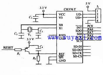 USB接口电路主要由文件管理控制芯片CH376T实现,CH376T支持USB设备方式和USB主机方式,并且内置了USB通信协议的基本固件、处理 MassStorage海量存储设备的专用通信协议的固件、SD卡的通信接口固件、FAT16和FAT32以及FAT12文件系统的管理固件,支持常用的 USB存储设备和SD卡。CH376T支持二种通信接口:SPI接口和异步串口。本设计采用SPI接口与MCU进行数据通信,电路连接方式如图2所示。串行数据输入SDI、输出SDO和时钟SCK分别接STM32F103VC的SPI1_MOSI。SPI1_MISO和SPI1_SCK,中断请求输出端 INT接PC0,片选端SCS由PA1控制。图中的RESET是系统复位信号,晶体振荡器Y1选12 MHz。当车主要进行指纹注册/删除或应急点火时,将密码钥匙(U盘)接入J1以读取密码信息。
