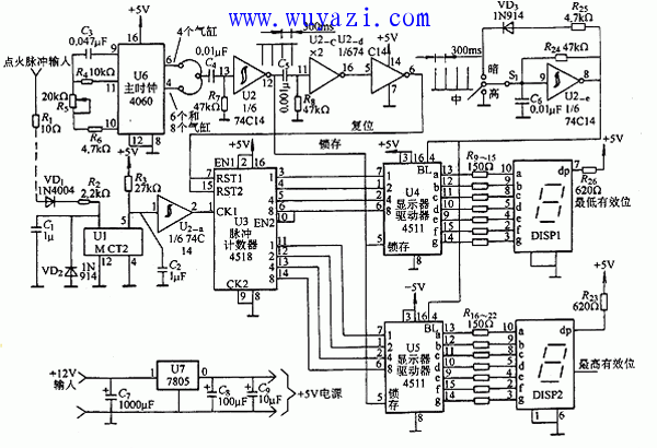 转速表显示发动机曲轴转速。一种数字式发动机转速表电路如图下所示,这种转速表由一个u1 和u2-a等组成的输入信号调节器、一个脉冲计数器为u3、两个显示驱动器u4 和u5 带动两个电子显示装置disp1 和disp2、一个主时钟为u6和一个电源稳压器u7等组成。其输入信号取自发动机点火系分电器中的断电器触点断开时产生的脉冲信号,以此作为电路触发脉冲信号。电路中所有+5v电源均由稳压器u7提供,u7 的电源则由汽车12 v电源提供。可显示两位有效数字的发动机转速。
