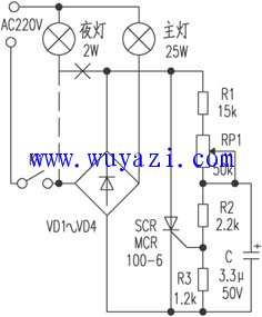 调光台灯的电路非常简单,仅仅是一个可控硅调压电路而已。市场上见到的电路大多是第二个图所示的电路,工作原理是:当交流电的正半周或副半周到来是,经过全桥整流,加到可控硅上的电源是单向的。该电压通过电位器给电容充电,当电容C1上的电压达到一定数值后,就会触发可控硅导通。调节电位器的旋钮,可以改变充电的时间,从而控制可控硅的导通角。其中单向可控硅使用MCR100-6,二极管使用1N4007。灯泡应选择60W以下的白炽灯。