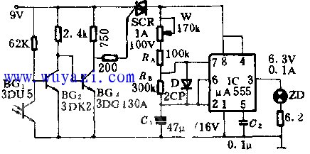 白天由于光线充足,BG3导通,SCR阻断,由IC等构成的振荡电路无电压不能工作,故指示灯不亮。夜晚,由于BG3截止,SCR受触发而导通,所以由IC等构成的振荡电路启振,IC的3不断输出超低频方波,其频率f=1/T=1.44/(W+Ra+2Rb)·C,可看到IC的3与地间所接的指示灯一闪一闪发光,十分醒目。调整Ra·Rb成C1的大小可改变闪光的频率。