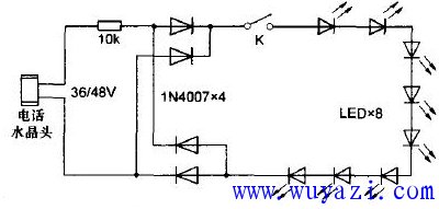 又称免电灯(即网上卖家俗称的缅甸灯),因为它采用普通家用固定电话的进线电压做电源,无需电池或交流市电,把尾部的水晶头插入电话分机接口即可照明,不用另交电费,也不用担心停电。此外还能兼作电话来电闪烁灯。提醒听力不太好的老年人及时接电话,因电话摘机后LED灯会熄灭,还能帮你及时发现电话是否被他人盗打,同时也具有一定的防雷击保护作用。不过由于该产品使用的是电话所属的电信机房馈电电源,使用时一旦索取电流过大难免会影响电话拨打和传真收发,特别是ADSL宽带用户拨号上网时容易造成频繁掉线。图3是电话线LED灯电路工作原理图,36V或48V的电话线路直流电压经10kΩ限流电阻并由4个二极管(或整流桥)作极性变换后加在LED上,当电话馈电电压为36V时,实测工作电流约1.2mA,亮度偏低,把限流电阻换成5.6kΩ时工作电流升为2.1mA:亮度稍微有些增加。