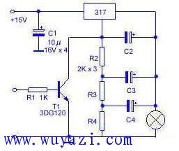 LM317常用作电压稳压器中的调整元件,这里给大家介绍一个不寻常的应用,只要配上不多的外部元件,可以使一个12V的小灯泡闪烁发光。