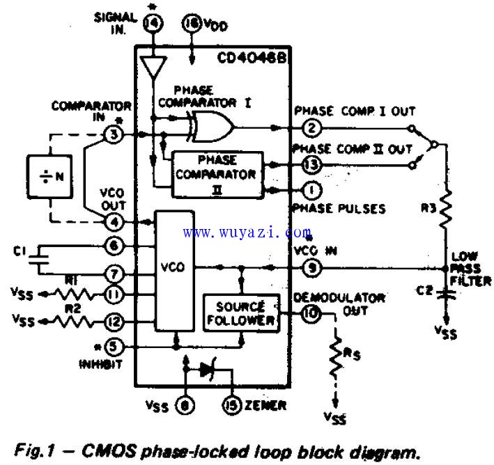 CD4046是通用的CMOS锁相环集成电路,其特点是电源电压范围宽(为3V-18V),输入阻抗高(约100MΩ),动态功耗小,在中心频率f0为10kHz下功耗仅为600μW,属微功耗器件。