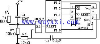 采用89C51单片机和X25045组成的看门狗电路,X25045硬件连接图如图2所示。X25045芯片内包含有一个看门狗定时器,可通过软件预置系统的监控时间。在看门狗定时器预置的时间内若没有总线活动,则X25045将从RESET输出一个高电平信号,经过微分电路C2、R3输出一个正脉冲,使CPU复位。图2电路中,CPU的复位信号共有3个:上电复位(C1、R2),人工复位(S、R1、R2)和Watchdog复位(C2、R3),通过或门综合后加到RESET端。C2、R3的时间常数不必太大,有数百微秒即可,因为这时CPU的振荡器已经在工作。