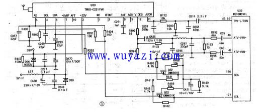 本机所用单芯片MST6M69FL(U39),支持8路模拟输入端口,可直接对模拟复合视频、S-VIDEO视频进行解码。LT42710FHD机型采用的是一体化高频头,高频头电路如图1所示。一体化高频头U30(TMI8-C2211VH)引脚功能见表1。