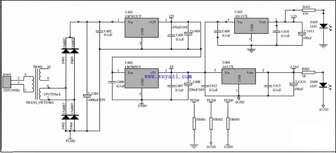 电源电路的主要功能是提供采集模块和控制模块的芯片电能供给。需求有单片机所需数字电压3. 3v,传感器所需电压5v、12v。以及模拟保护电压3. 3av。具体电路如图1所示。