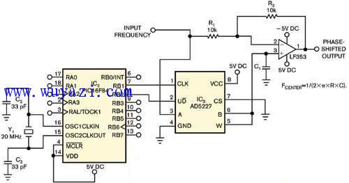 移相器广泛应用于各种电路,但由于在放大器中的偏差以及电容公差,通常很难实现电路精确控制所需的精确移相。图1中的电路利用AD5227 64步递增/递减数字电位器IC3可以控制输入到输出的移相,并替换电阻值。计算输出中心频率的公式为:FCENTER=1/(2×π×R×C)。AD5227可以取各种不同范围的电阻值。该例子中的电阻为10kΩ。通过步进64个点,720kHz输入正弦波可以从0度到360度循环若干次。AD5227作为一个电位器,A和B为两端,W为擦拭器。